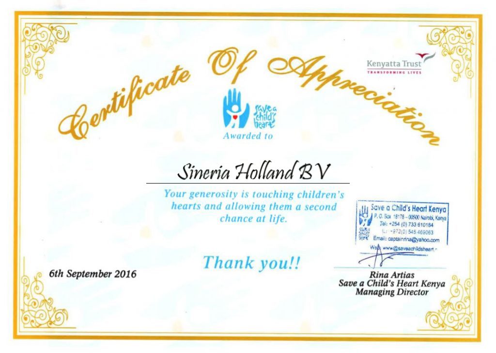 Since 2014 Sineria and its affiliates supported “Save a Child’s Heart” in Kenya. Many young children in Africa need lifesaving heart surgery and treatment in order to cure their heart disease and grow-up to live healthier and more productive lives. Save a Child’s Heart provides life-saving cardiac surgery and other lifesaving procedures.