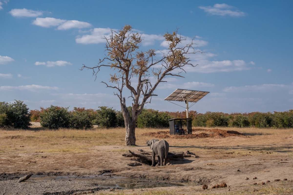 Hwange National Park is Zimbabwe’s biggest (14000 sq.km) wildlife reserve but does not have sufficient natural water supply to support the wildlife it contains. The natural water that pans within the park, which is normally fed only by seasonal rain, is now also fed by boreholes fitted with solar-powered water pumps year-round.